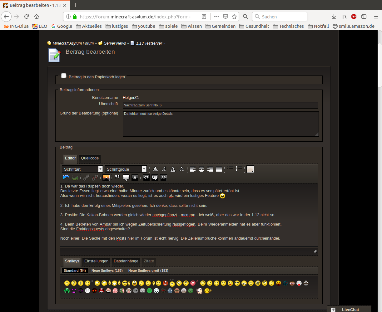 Lieber Besucher, herzlich willkommen bei: Minecraft Asylum Forum. Falls dies Ihr erster Besuch auf dieser Seite ist, lesen Sie sich bitte die Hilfe durch. Dort wird Ihnen die Bedienung dieser Seite näher erläutert. Darüber hinaus sollten Sie sich registrieren, um alle Funktionen dieser Seite nutzen zu können. Benutzen Sie das Registrierungsformular, um sich zu registrieren oder informieren Sie sich ausführlich über den Registrierungsvorgang. Falls Sie sich bereits zu einem früheren Zeitpunkt registriert haben, können Sie sich hier anmelden.