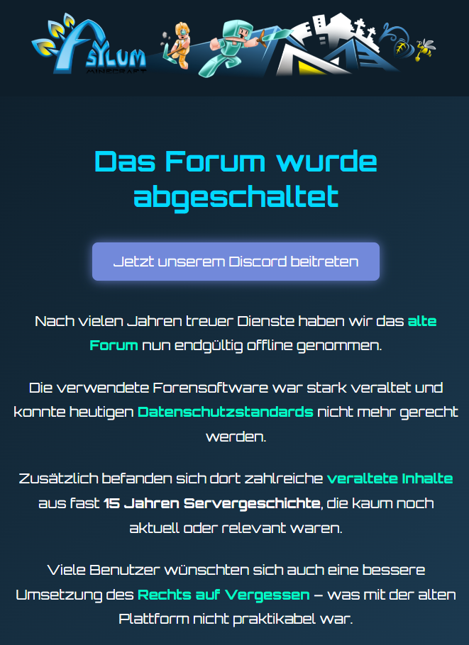 Wenn ihr noch Beiträge, Screenshots oder andere Dinge aus dem Forum für euch behalten möchtet, solltet ihr diese bis zum 01. November sichern. Danach ist es nicht ohne weiteres Möglich an die Inhalte heranzukommen. Alle Funktionen des Forums werden ab diesem Tag ausschließlich auf dem Discord verfügbar sein.